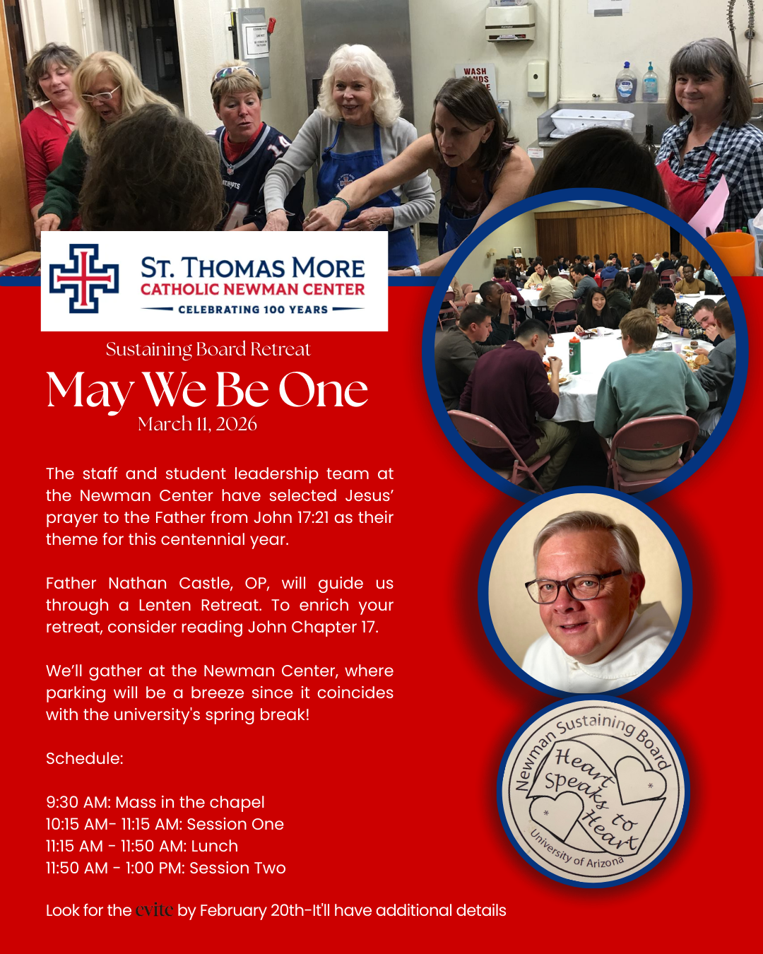 This private retreat for members of the Newman Center Sustaining Board will begin with mass at 9:30am. We will have two 1 1/2 hour sessions with lunch in between.